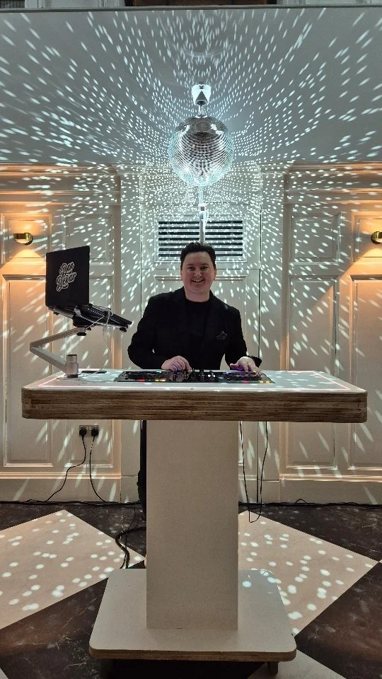 Bespoke DJ Furniture, Crystal Clear Sound, Modern Lighting effects with Classic Mirror Ball along with eye candy pixel tubes all designed specifically for weddings entertainment.