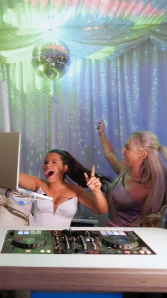 Bespoke DJ Furniture, Crystal Clear Sound, Modern Lighting effects with Classic Mirror Ball along with eye candy pixel tubes all designed specifically for weddings entertainment.